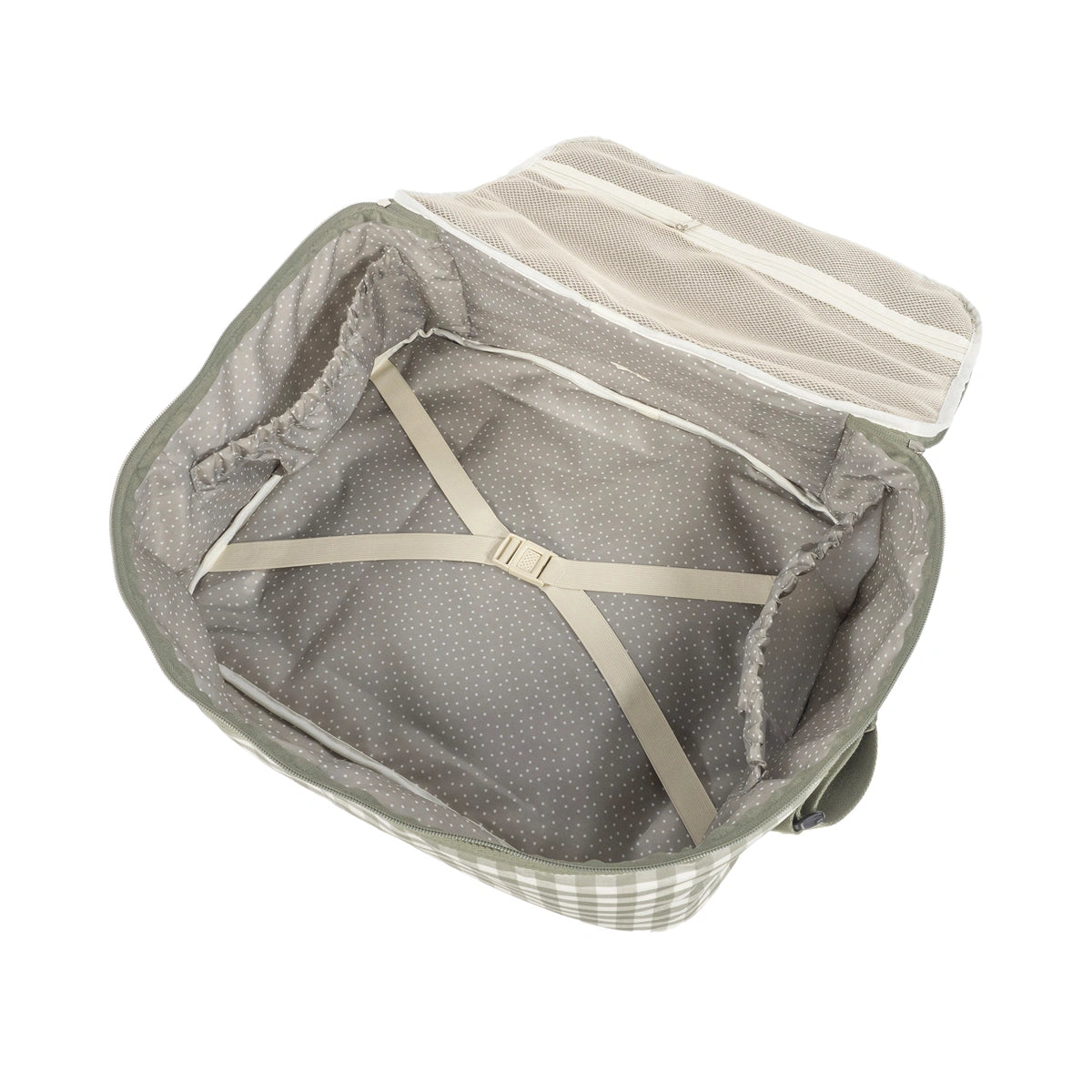 El compartimiento interior está forrado a juego y cuenta con gomas elásticas para mantener la ropa y otros artículos en su lugar.