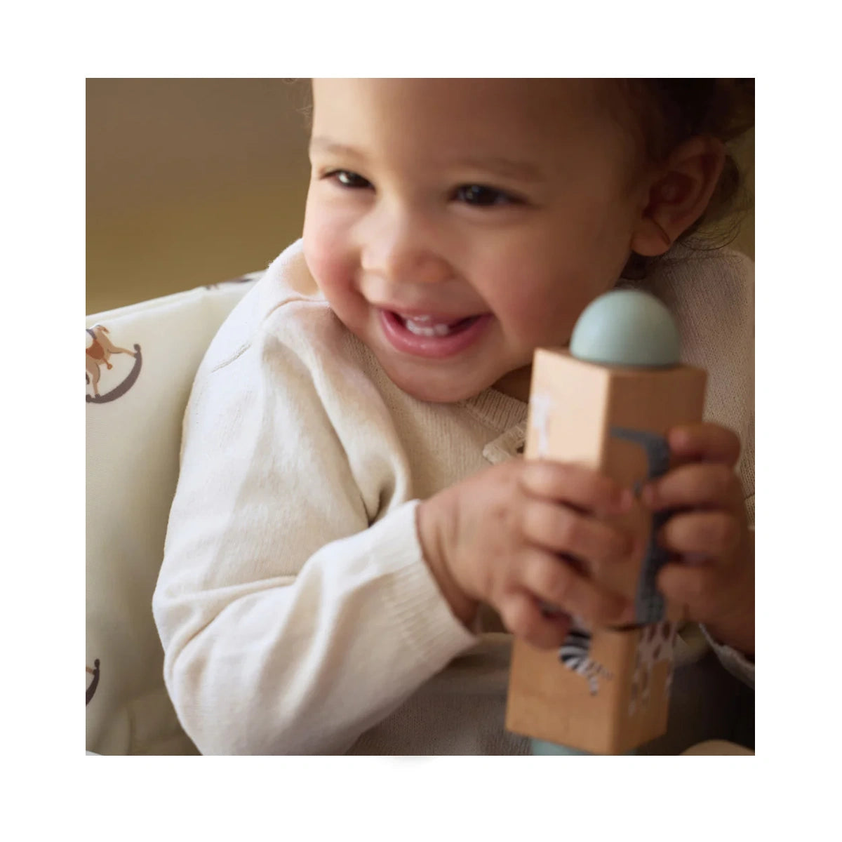 El rompecabezas de bloques Jungle Jambo es un juguete educativo y divertido que combina memoria, coordinación y observación. Consta de bloques de madera ilustrados que tu peque deberá girar para formar a los cuatro simpáticos animales.
