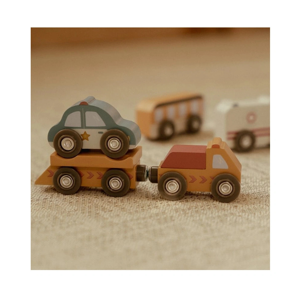 Estos vehículos de servicio y de emergencia de madera están diseñados para usarse en combinación con el juego de trenes de madera. Con neumáticos compatibles con los rieles, estos vehículos pueden circular por la ciudad y estar de ayuda donde se necesitan.